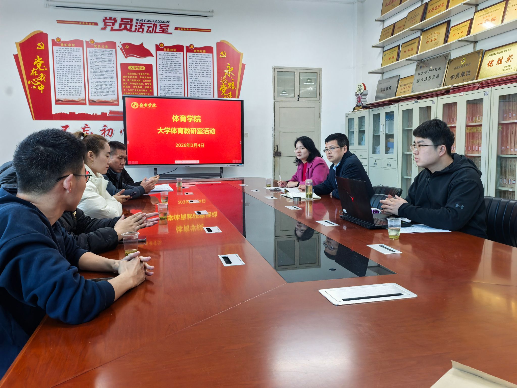 为进一步深化大学体育课程改革,丰富体育课程内容,激发学生运动兴趣,规范新型体育运动项目教学实施,2026 年 3 月 4 日下午,大学体育学院体育教研室在学院会议室召开新型体育运动项目专题研讨会。体育学院党委书记韩晔、副院长李靖出席会议,大学体育教研室主任王俊杰主持会议,大学体育教研室全体教师参加研讨。