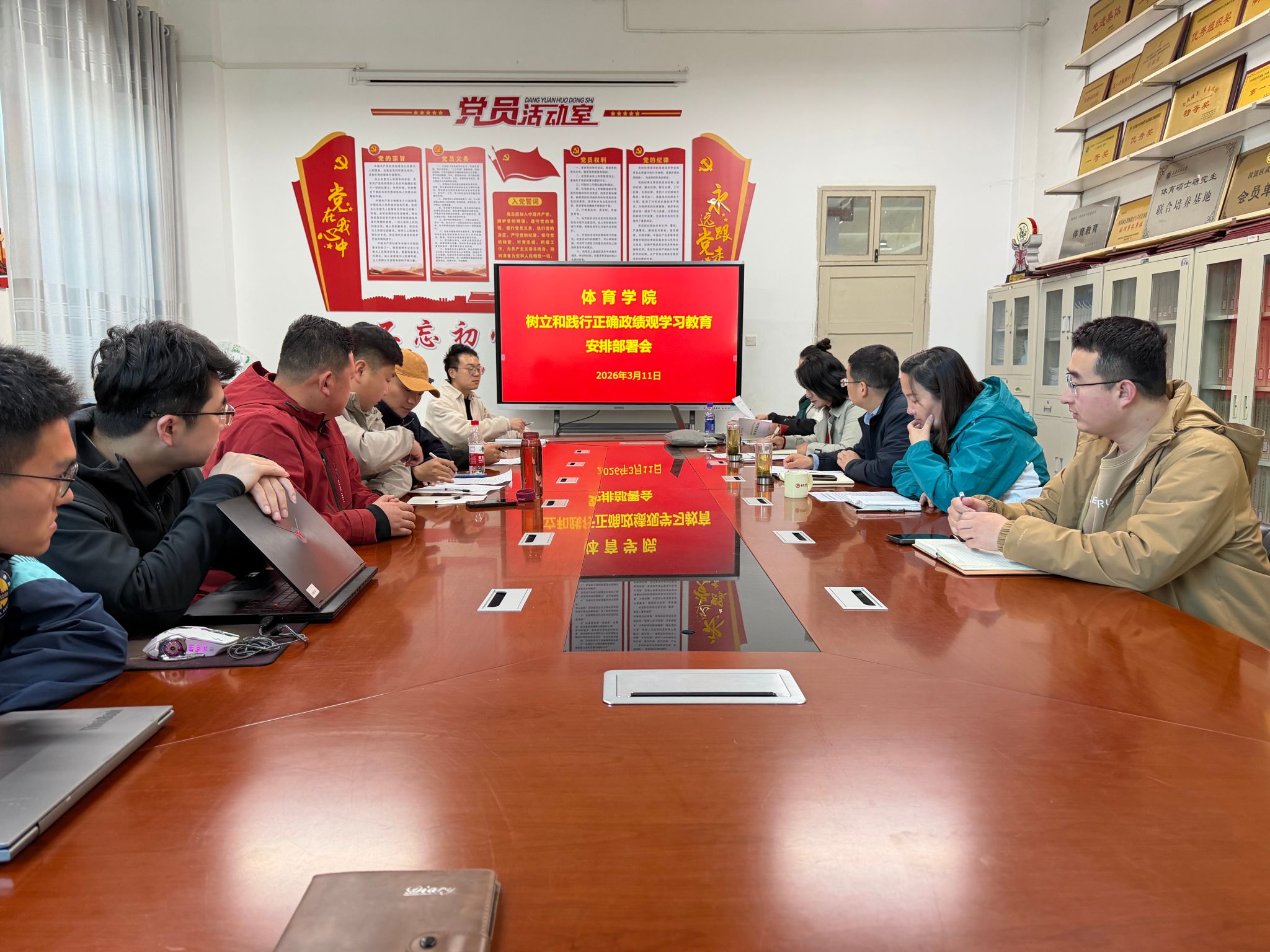3月11日,体育学院在体育馆一楼会议室召开体育学院党总支理论学习中心组(扩大)会议,专题学习习近平总书记关于树立和践行正确政绩观学习教育的重要讲话和重要指示精神,部署学院树立和践行正确政绩观学习教育工作。学院领导班子成员,中心组成员,各支部支委,全体行政管理人员、学工人员参加会议。会议由学院党总支书记韩晔主持。